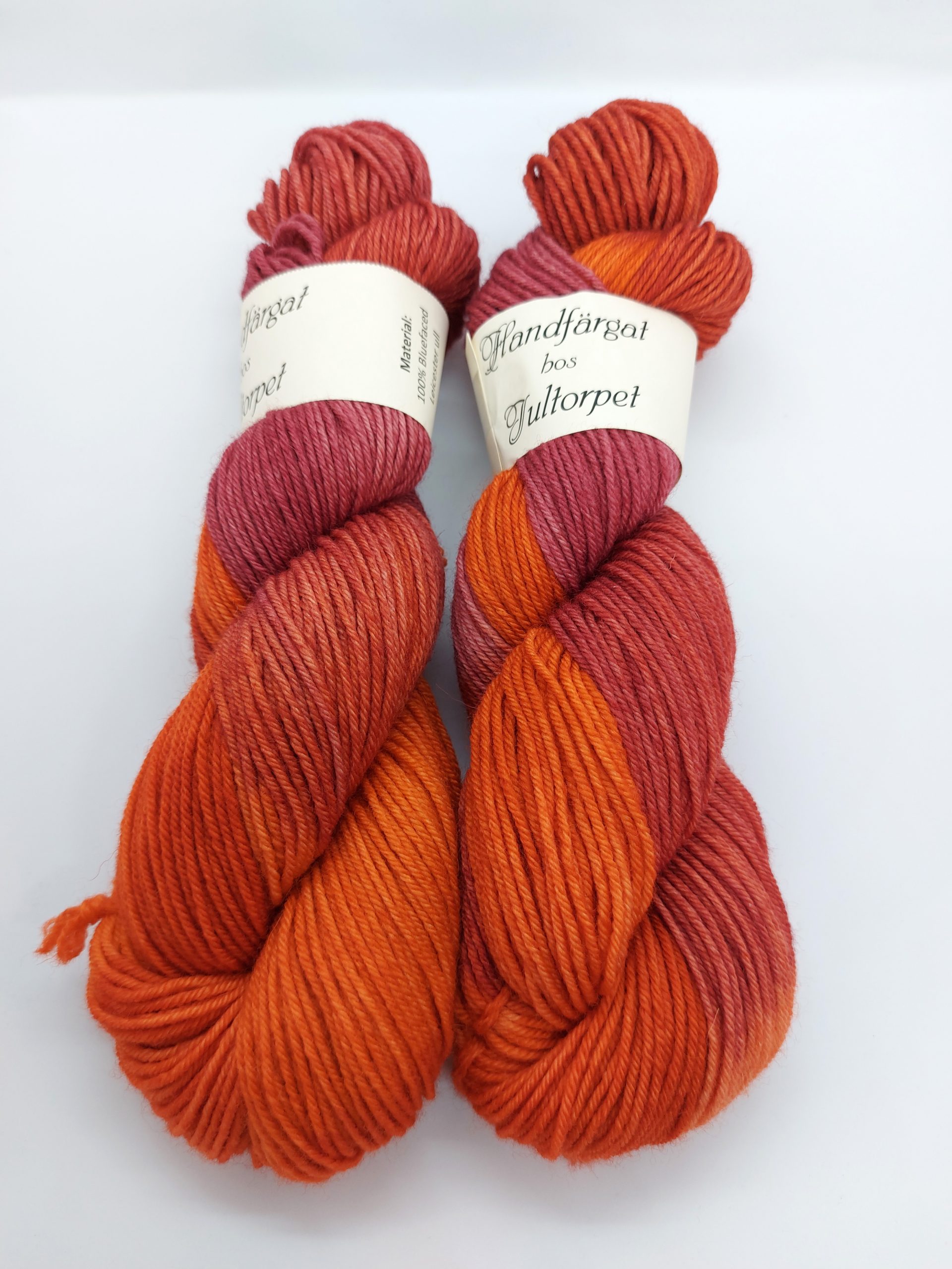 Handfärgat 100% Bluefaced Leicester garn i olika orange/röda nyanser.