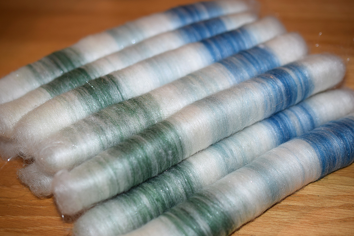 Kardrullar i naturvitt, grönt, ljusblått och blått.