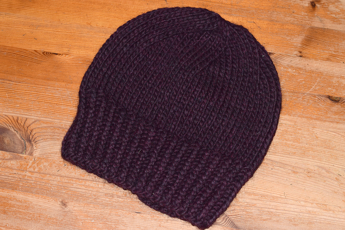 Mörkt plommonlila mössa i 50% merino, 25% alpaca, 25% akryl.