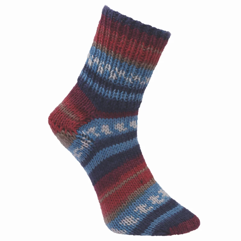 De flerfärgade nyanserna ger fina ränder på just sockor och ett nystan á 150 gram räcker till ett par sockor i vuxenstorlek.