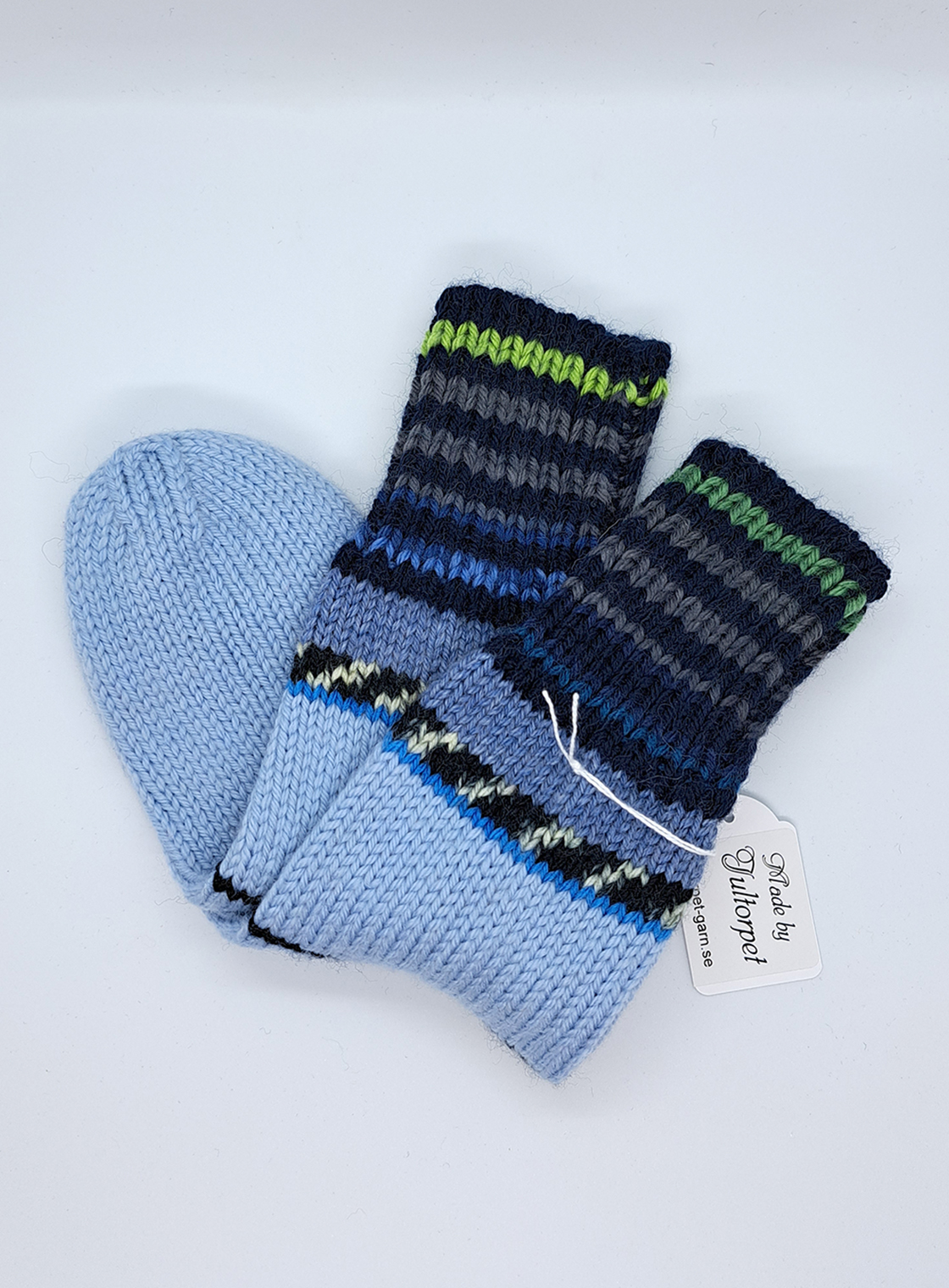Varma, mjuka och sköna. Här i ljusblått med marin, grå och gröna ränder.