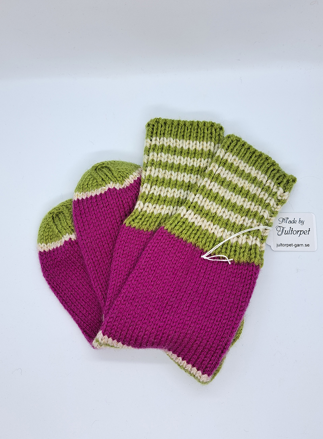 Varma, mjuka och sköna. Här i cerise och grönt med detaljer i naturvitt med guldtråd.